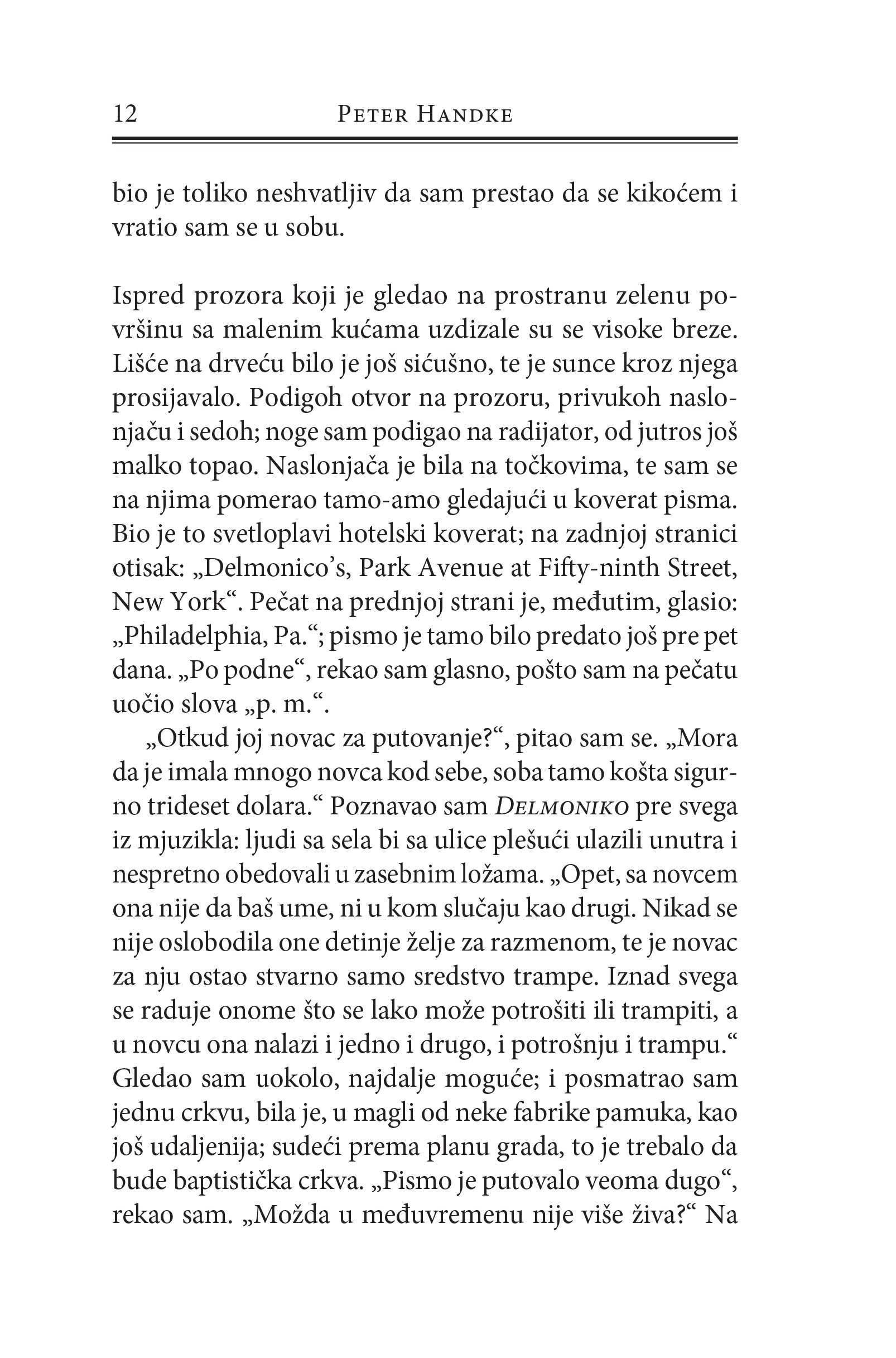 U ovom intimnom i potresnom romanu, Peter Handke vodi čitaoca na emocionalno i geografsko putovanje kroz Ameriku – ali još više kroz unutrašnji pejzaž dvoje ljudi koji ne umeju da ostanu zajedno, niti mogu da se potpuno razdvoje.