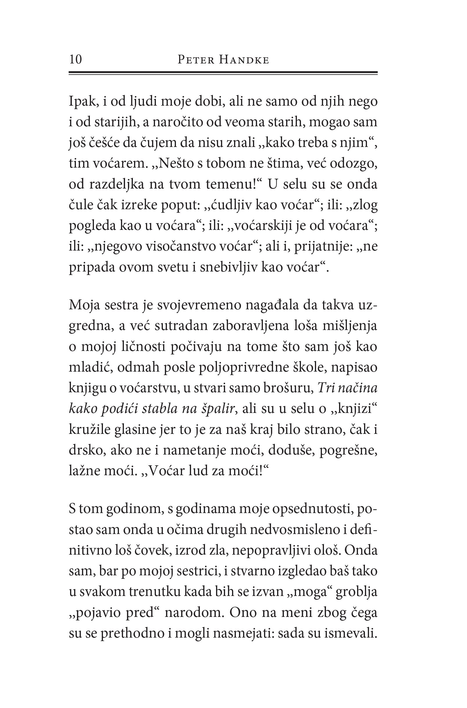 U ovom neobičnom i duboko simboličnom romanu, Peter Handke pripoveda o voćaru za koga selo veruje da je opsednut demonima. Danju je tih, usamljen, posmatra polja i voćnjake. Noću – spava u šatoru kraj groblja, razgovara sa životinjama, sluša vetar, pokušava da pronađe smisao u tišini koja raste u njemu.