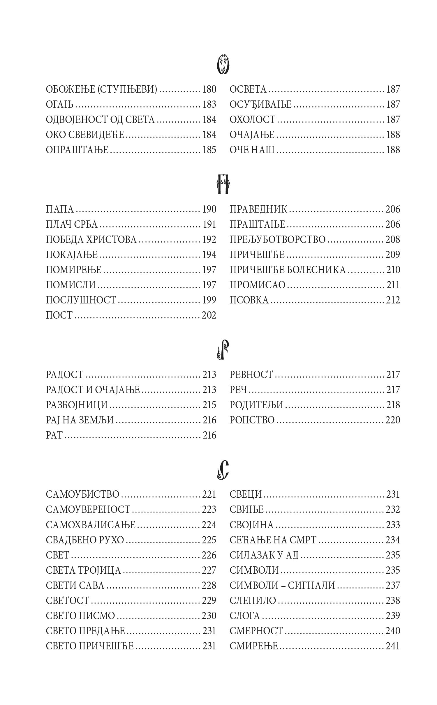 Azbučnik pouka Svetog Nikolaja (Velimirovića), svesrpskog „Deda Vladike”, dolazi nam u pravi čas da nas pouči, opomene i putevodi ka Nebeskoj Srbiji. Knjiga sadrži mnoštvo pragmatičnih saveta o životu u veri, i služi kao ogledalo u kome duša može da prepozna svoje duhovno stanje. Za sve koji se ne mire sa zatečenim, grešnim sobom, i koji žele da idu putem svojih svetih predaka!
