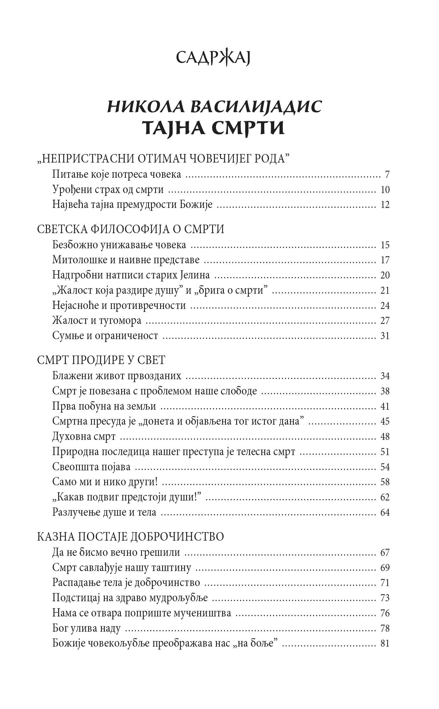 Књига „Тајна смрти: Шта нас чешка во вечни“ автора Николе Василијадиса поштавлија основно питање љубовна животна - питање смисла. Без одговорност на ова питање, живот пошта бесмислен, човек нерешан. Василијадисова књига истражује тајну смрти како клјучни тајну нашег постоња. Она нас води на Дубоко Духовно Путовање Где се оваа Тајна Открива како путка за наше вечно постоење. Kroz duboke analize i duhovna promišljanja, autor nas vodi korak po korak ka razumevanju smisla života i priprema nas za vecnost.