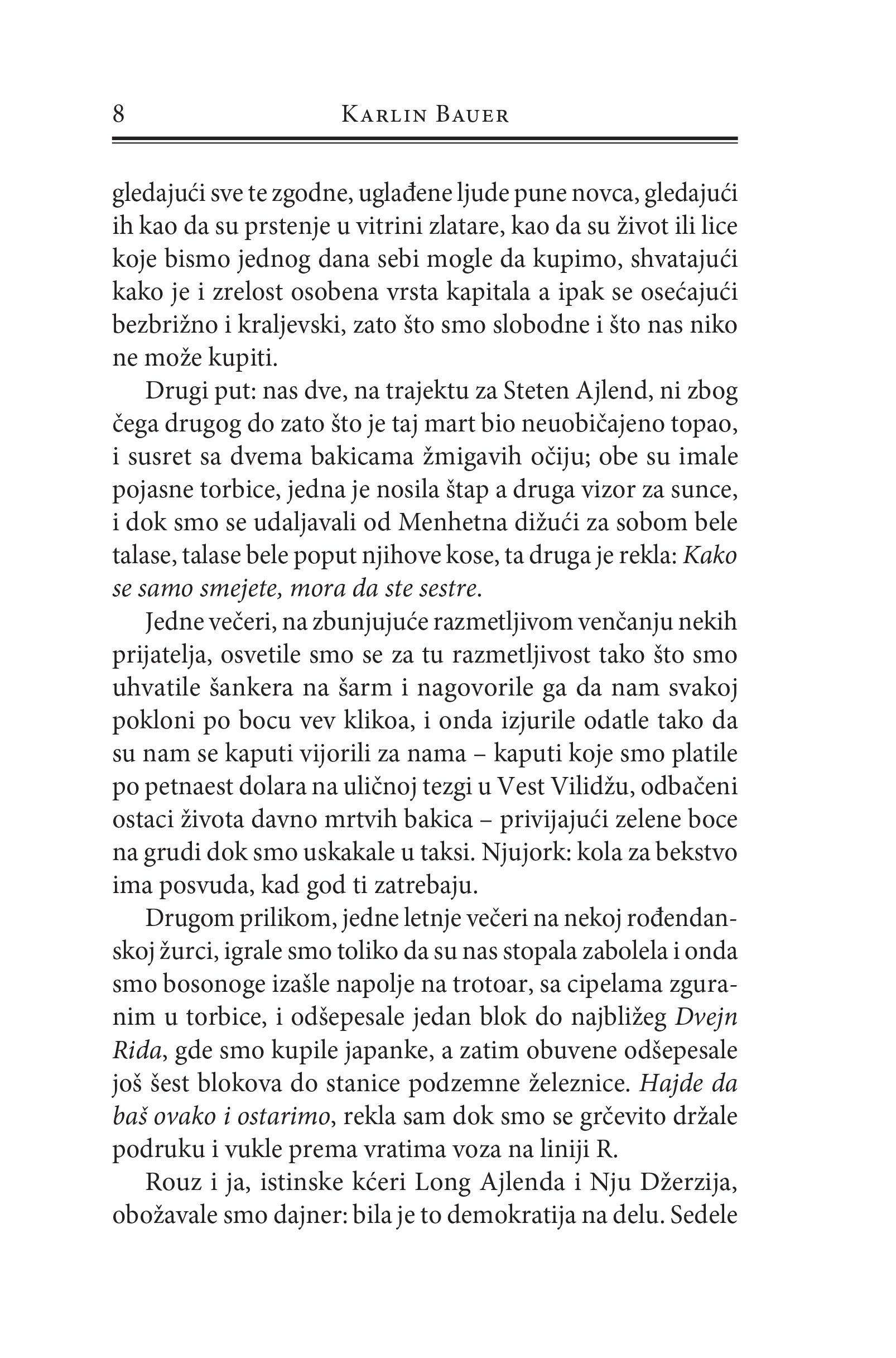 Roman nežno, a istovremeno brutalno tačno prikazuje žensko prijateljstvo – kao podršku, ogledalo, rivalstvo i utočište. To je priča o dve žene koje pokušavaju da ostanu verne sebi u svetu koji stalno menja pravila.